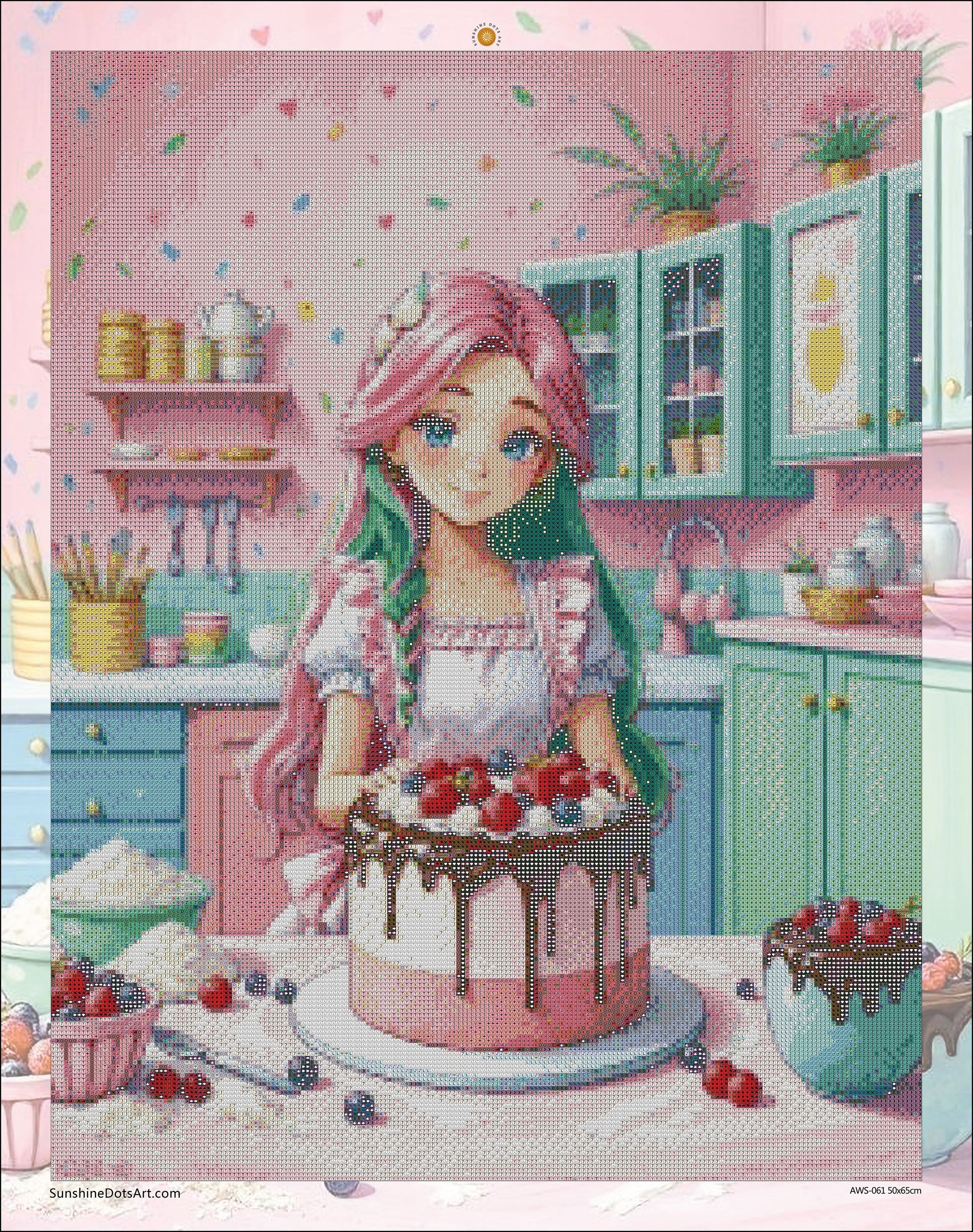 Bring a touch of sweetness into your world with the Berry Whip Delight Diamond Painting Kit. Featuring a pastel kitchen scene with a cheerful baker and a decadent berry-topped cake, this design blends cozy charm and whimsical delight for a treat that never ends.