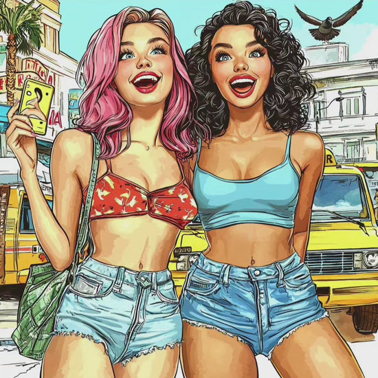 Bring bold city vibes into your world with the City Stroll & Selfies Diamond Painting Kit. Featuring two stylish friends posing for the perfect shot under the sunshine, this artwork captures carefree energy, vibrant colors, and the joy of friendship. A must-have for anyone who loves fun, fashion, and a touch of glam.