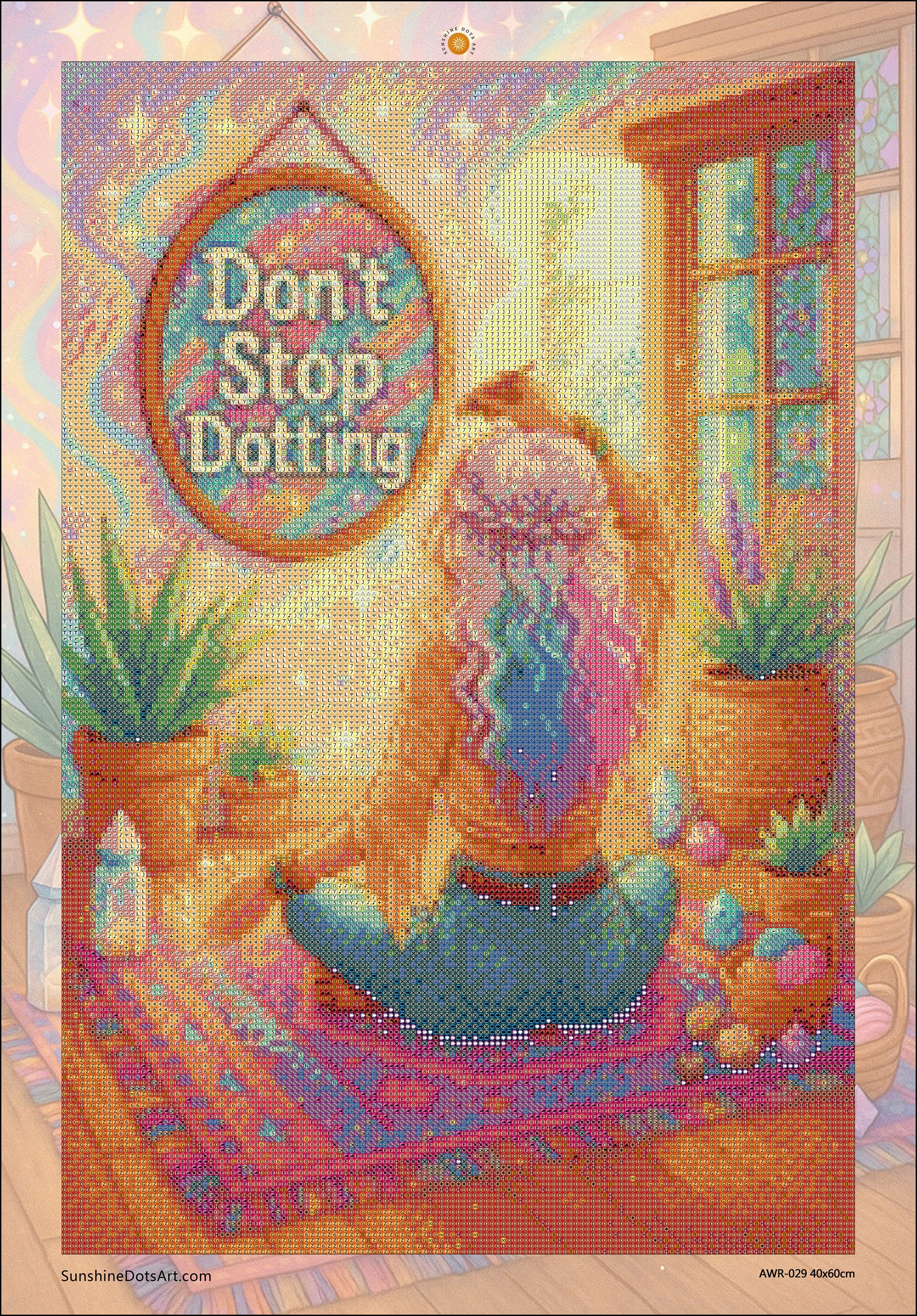 Bring a spark of motivation into your world with the Don’t Stop Dotting Diamond Painting Kit. Featuring a serene scene of a rainbow-haired muse sitting in a cozy, sunlit room surrounded by crystals, plants, and magical light, this artwork is a vibrant reminder to embrace creativity and keep shining. It’s the perfect piece for dreamers, artists, and diamond painters who love inspiration woven into their craft.