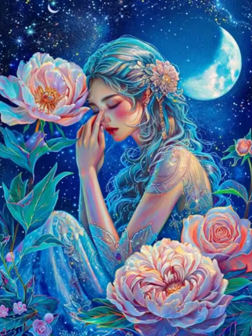 Bring a touch of dreamlike beauty into your world with the Moonlit Bloom Diamond Painting Kit. A serene goddess sits among glowing flowers beneath the crescent moon, her expression soft and contemplative. With delicate blossoms, shimmering starlight, and radiant metallic highlights, this artwork feels both celestial and romantic — a perfect choice for lovers of mystical elegance.