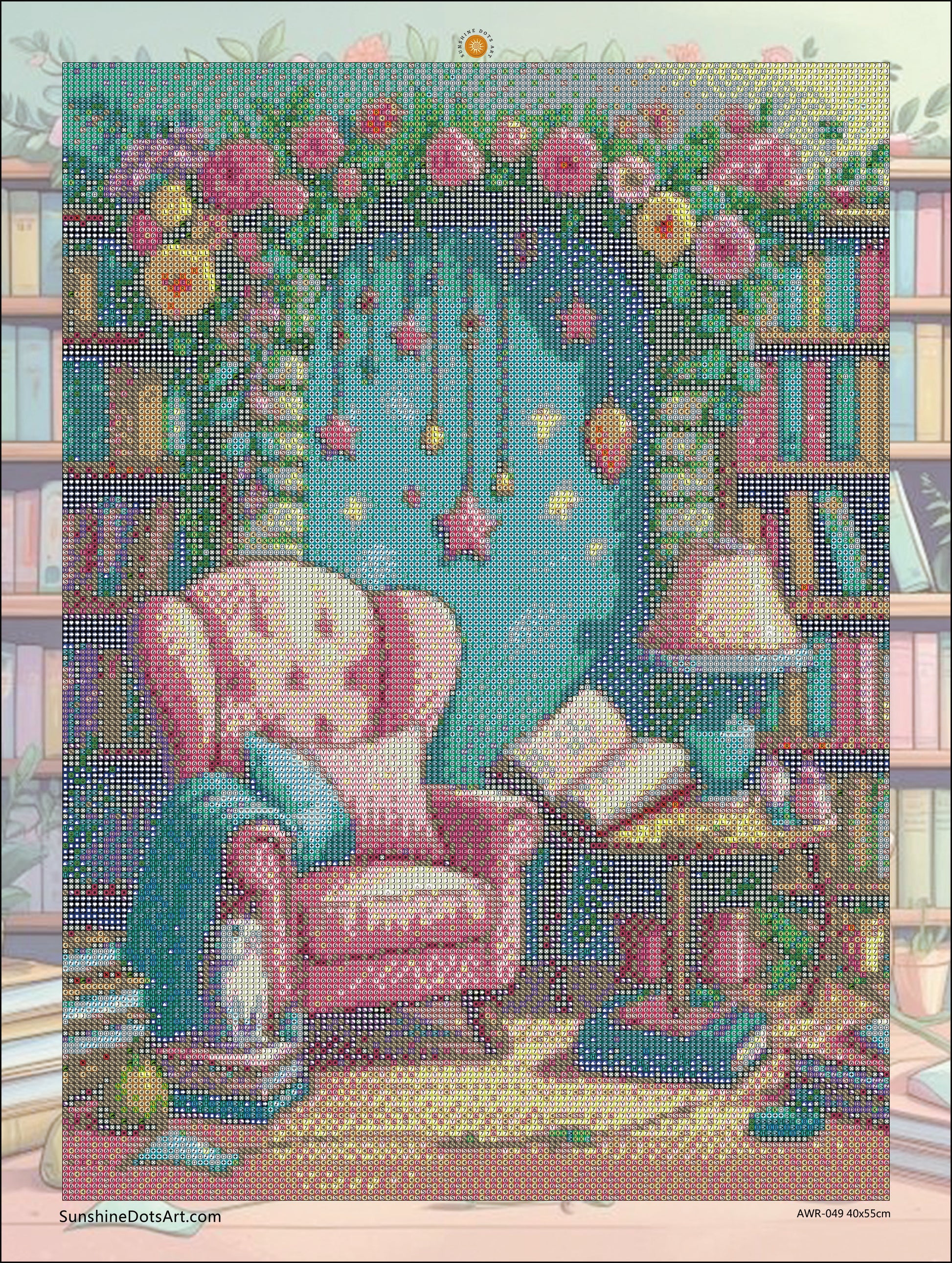 Curl up in your own cozy corner with the Whimsical Book Nook Diamond Painting Kit. This charming artwork features a pastel reading nook filled with books, glowing lanterns, and a comfy chair under a flower-draped window—a dreamy escape for every book lover.